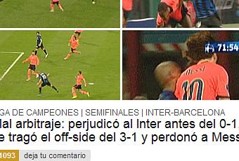 Empiezan comentando que el colegiado portugués Benquerença (amigo de Mourinho por cierto) se inventó un fuera de juego de Diego Milito en el minuto 9, cuando el argentino, que había recibido el balón de Samuel Etoo en posición legal, se marchaba solo hacia Víctor Valdés. Correcto, no era fuera de juego ni por asomo. Pero no comentan que la jugada viene precedida de una clara falta sobre un jugador culé, por lo que el fuera de juego o no, poco debería importar.
