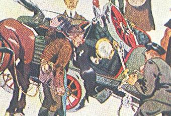 Los primeros automóviles solían tener frecuentes problemas en sus partes mecánicas y nos dejaban tirados a la vera del camino. Eso parece ser lo que pasó en la situación descripta en la ilustración vienesa de 1904. No solo se rompió la rueda trasera izquierda, sino que un caballo lleva de tiro al encaprichado automóvil.