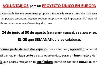 ANA (Asociación Navarra de Autismo) ha iniciado una segunda convocatoria en la que se solicitan voluntarios para la Escuela de Verano para niños con Autismo, se trata de un proyecto que se inició el año pasado y que tuvo muy buena acogida, es un proyecto único en el que se propone la escuela de verano como una alternativa en la que se combina el ocio, la diversión y el aprendizaje con la terapia, aunque como dice la asociación lo más importante es que los pequeños disfruten y vivan una grata experiencia.