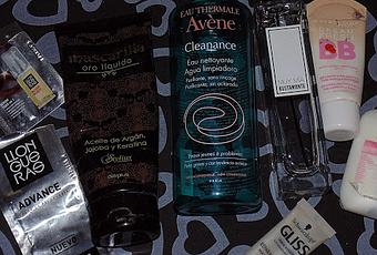- Serum todo en 1 de Llongueras: Tengo varias muestras de este serum y lo uso de vez en cuando solo en las puntas y siempre como acabado ya que deja un brillo muy bonito. Cada muestra contiene 1.5ml.- Tratamiento intensivo del color: Es la mascarilla que viene siempre con los tintes que alguna vez mi tía no lo usa y me lo suele dar para que lo gaste yo. La verdad que no me disgusta este tipo de muestras. Contiene 20ml.- Mascarilla Oro Líquido de Stylius de Deliplus: Esta mascarilla me gustaba mucho, y me sigue gustando pero llevo un tiempo sin comprarla. Contiene Aceite de argán, jojoba y keratina, contiene 200ml.- Agua Limpiadora Cleanance de Avène: No la he vuelto a comprar pero me gusto mucho. Aquí os dejo el post que hice de este producto. Puede que repita algún día. Contiene 400ml y es para pieles grasas y con tendencia acneica.- Colonia Muy Mia De David Bustamante: Esta colonia me encanta es mi favorita sin ninguna duda y además no llega a los siete euros. Repito siempre con ella.- BB cream Dream Fresh de Maybelline New York: He tardado en terminarla un monton, Y no me gusta mucho, así que no voy a repetir con ella. Es en el tono medio claro y tiene SPF 30. Contiene 30ml.- Excellence Creme de Loreal Paris: Otra mascarilla que viene con los tintes.Está en este caso contiene 44ml.- Mascarilla mini Reparación total de Schwarzkopf: De estas mascarillas mni son las que suelo comprar para cuando me voy de viaje, porque con poquito que uses es suficiente, Esta es para cabello seco, con keratina líquida y contiene 20 ml y suele costar 1€.
