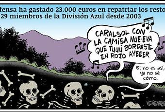 · Defensa ha gastado 23.000 euros en repatriar restos de 29 miembros de la División Azul. Y ello, manteniendo el presupuesto para recuperación de las víctimas del franquismo a cero, y aumentando los gastos de Defensa en un 30%. Doña Finiquita en Diferido está que lo tira.