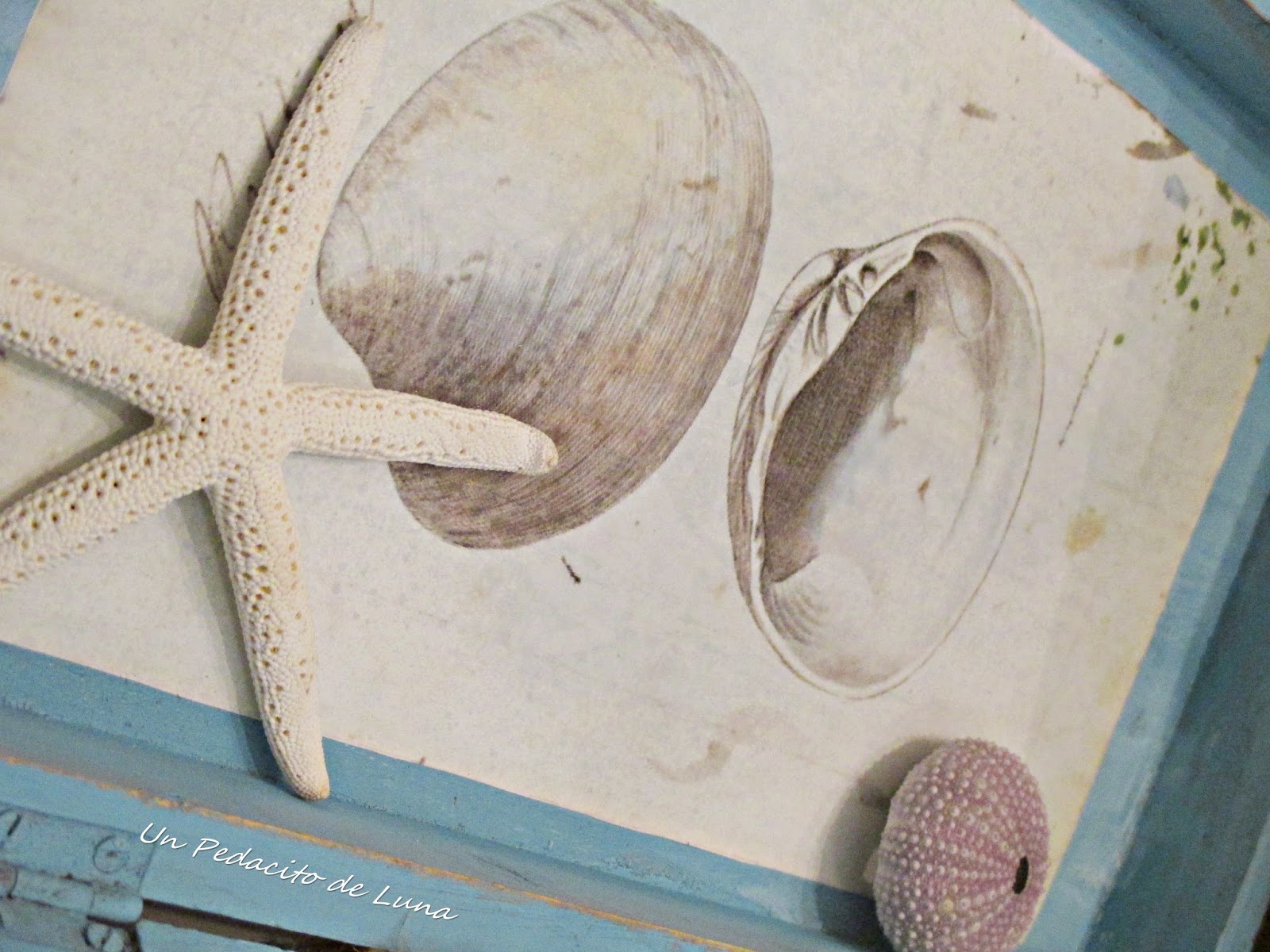 Para el interior escogí unas láminas de caracolas y cangrejos que le dieron sabor.Ni siquiera las transferí, son fotocopia tal cual, bien encoladas y protegidas con barniz.
