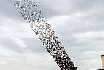 El proyecto parte de una escalera construida con alambres soldados que va desmaterializándose hasta terminar despareciendo en la nada para después volver a aparecer en lo alto de un edificio situado al otro lado de la calle.