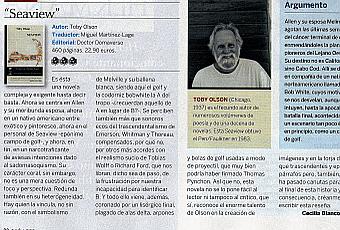 Mientras dedico el escaso tiempo que últimamente consigo sacar para la lectura a la sorprendente, macabra y soberbia Un rey sin diversión de Jean Giono, aprovecho la tarde de viernes para dejarles por aquí la reseña que una servidora firma en el número del Qué Leer del corriente mes. Su objeto es Seaview, de Toby Olson, una de las novelas más complejas y difíciles con las que jamás me he topado. Aprovecho, asimismo, la ocasión para lamentar la treintena abundante de faltas de ortografía y errores ortotipográficos que campan a sus anchas por el texto. La editorial podrá ser pequeña y modesta y no tener correctores en nómina pero el lector, creo yo, no tiene por qué sufrir las consecuencias.
