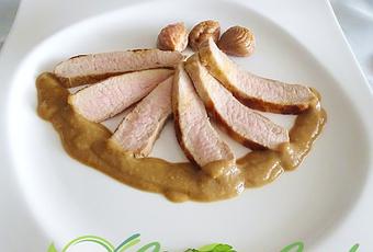 Servir enseguida acompañado de la salsa de castañas bien caliente y las castañas enteras que tenemos reservadas.