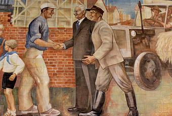 El pueblo que apoya feliz al régimen y marcha camino a un progreso inminente es una de las postales más vistas en testinomios artísticos de la época. (Cabe aclarrar que expresiones similares se dieron en otros sistemas políticos y de las más variadas ideologías en el mundo).