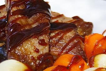 Elaborar en casa este tipo de carne es muy sencillo; sólo marcar con fuego fuerte dos minutos por cada lado, retirar del fuego y añadir sal. Pero los filetes tenían mucha grasa, así que retiré parte de ella y la coloqué en una cazuela a fuego suave hasta ser líquido acompañado de media taza de vino blanco. Colé y lo agregué de nuevo a la cazuela añadiendo una pizca de sal y 100 gramos de miel. Dejé cocinar hasta espesar mezclando de vez en cuando con una cuchara de palo. Estupenda salsa para acompañar esta carne. Me encanta la combinación dulce salado. Como acompañante elegí patatas y zanahorias cortadas con un sacabocados para una bonita presentación. Espero os guste.