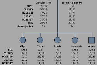 El destino de sus restos fue una absoluta incógnita hasta que en 1979 se anunció el hallazgo de una fosa común en Yekaterinburg con nueve esqueletos que podrían corresponderse con las exequias de la familia Romanov. Los cuerpos habían sido maltratados y rociados con ácido para dificultar su identificación. Estudios antropológicos de la época constataron que la tipología de los restos (edad, sexo, piezas dentales…) podría corresponderse con los integrantes de la familia real, si bien revisiones posteriores apuntaban indicaban laausencia de los restos de zarevich Alexei y de la gran duquesa Anastasia (González-Martín, 2003). Pese a las dificultades intrínsecas para la obtención de resultados en el análisis de DNA nuclear, se obtuvo una muestra suficiente para genotipar los cuerpos. En primer lugar, se verificó el sexo de los esqueletos (previamente establecido por análisis antropológicos) por la amplificación del gen de la amelogenina. Se estableció el grado de parentesco entre los integrantes de la tumba por el análisis de varios loci tetraméricos microsatélite. En el trabajo original de Gill et al (1994) se emplearon los marcadores