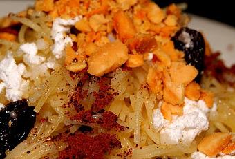 INGREDIENTES250 gr. de fideos cabello de angel75gr. pasasAzucar glassCanelaAlmendras tostadasmantequillaAceite olivasalELABORACIÓN Este es un plato típico marroquí que me sorprendió mucho en marruecos, a veces se acompaña con un guiso de pollo pero yo lo he preparado simple. Para empezar ponemos una cazuela a cocer con agua para el baño maría. Mientras, echamos una cucharadita de aceite de oliva a los fideos y los impregnamos.