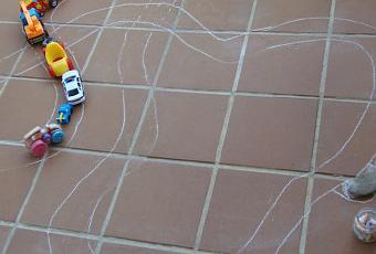 Ayer Alejandro no tenía ningún interés en trabajar con ninguno de los materiales de su “rincón Montessori”; en lugar de eso decidió jugar en la terraza con sus coches. La idea de dibujar una carretera y un semáforo con tiza en el suelo fue una sugerencia mía, pero si no le hubiera interesado la hubiera descartado al momento…y yo lo hubiera respetado.