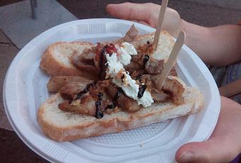 El pincho de la caseta de la cafeteria Productor, lo llaman el Pizarral y es secreto iberico con salsa cebolla crujiente y un poco de queso fresco. Muy bueno. 祭りの特別ピンチョは「ピサラル」。鉄板焼きされたイベリコ産豚肉の上にフィラデルフィアチーズ、そしてジャムとオニオンフライがトッピング。肉がびっくりするくらい柔らかくてジューシーで、チーズとジャムの組み合わせがバッチリ!アイスクリーム用のスプーンが刺さっているかと思いきや、フォークになっているので、手を汚さずに食べられるという工夫も!