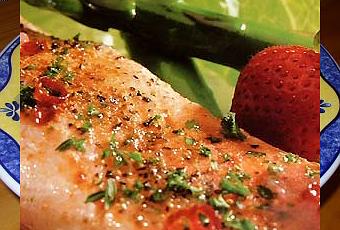 Salmón: 6 filetes de salmón (150 g cada uno)6 fresas de California Strawberry Commission, en mitades1 ramita de tomillo fresco al gusto