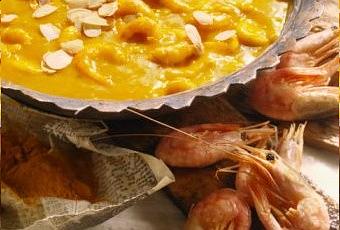 4 finas lonchas de mango maduro1 cucharada de yogur griegoPara el curry125 gr de aceite de oliva30 gr de ajo250 gr de cebolla20 gr de jengibre rallado o en polvo50 gr de guindilla5 gr de cúrcuma10 gr de cilantro fresco picado finamente2 gr de semilla de mostaza2 gr de semilla de cardamomo500 gr de tomate pelado y troceado½ limaPreparaciónEn una sartén con Aceite de Oliva, calienta y sofríe y sofríe la cebolla y el ajo.Mientras, en un mortero muele las semillas de cardamomo y añade los demás ingredientes. Lleva todo a fuego medio por 30 minutos y luego tendrás el curry.En una plancha caliente cocina los langostinos, añadiendo el zumo de lima. Los sacas cuando estén dorados.Para armar el plato, coloca en una fuente el mango cortado en lonchas, luego el curry y finalmente los langostinos alrededor. Rocía con una cucharada de yogur.Fuente: cocina