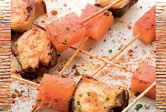 Ingredientes para 4 personas: - 16 tacos de pulpo hervido- 16 tacos de sandía- 16 brochetas- 1 cucharadita de pimentón dulce- Aceite de oliva virgen- 1 cucharadita de sal gruesa- 1 cucharadita de cebollino picado 1) Pinchar los dados de sandía con el pulpo y añadir abundante aceite, sal gruesa y pimentón dulce.