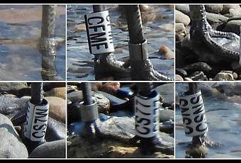 Un grupo de gaviotas de Audouin descansaba en la pequeña isla que emerge frente a la CCC cuando el caudal procedente de la central eléctrica no la cubre por completo. Entre ellas, seis llamaban la atención por sus anillas de PVC blanco con inscripciones negras, auténticos “carnés de identidad” para quienes seguimos de cerca sus movimientos.