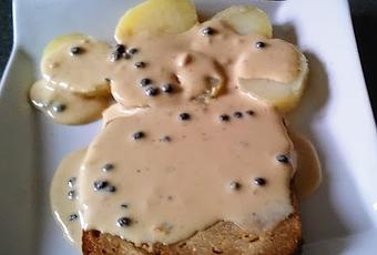 Por ultimo hacer a la plancha los filetes de seitán en una sartén con un chorro de aceite. Servirlos en el plato y cubrirlos con la salsa. Acompañar con las patatas cocidas, o con puré de patata o con unas verduras, como más te guste.