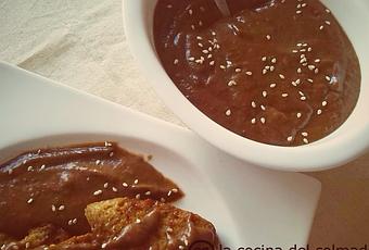 PARA EL MACERADO2 cucharadas de aceite de oliva virgen extra2 cucharadas de salsa de soja1 cucharada de sirope de ágaveUna pizca de sal de GuérandePARA LA SALSA1/2 cebolla100-120 g de ciruelas secas (reserva alguna para decorar)Un chorrito de vino dulce1/2 cucharadita de canela1/2 cucharadita de nuez moscadaAceite de oliva virgen extraSal de GuérandeSemillas de sésamo para decorarPREPARACIÓNEn una fuente, mezclamos los ingredientes del macerado. Cortamos el seitán en lonchas finitas y las ponemos a macerar. Si el plato lo tomas para cenar, puedes dejarlo macerar desde por la mañana. Si lo vas a tomar a mediodía, ponlo a macerar la noche anterior (siempre en el frigo).Deja las ciruelas en remojo en un cuento con agua, el mismo tiempo que el seitán macerando, también en el frigo.Para preparar la salsa, pon en una cazuela un chorrito de aceite y añade la cebolla picada. Sofríe unos minutos. Incorpora las ciruelas escurridas (reserva el agua), el vino, la canela, la nuez moscada y la sal. Cocina a fuego medio-fuerte hasta que el vino reduzca. Tritura con la batidora y ve añadiendo agua del remojo de las ciruelas hasta conseguir la consistencia que desees.Pasa por la plancha las rodajas de seitán y sirve con la salsita por encima. Decora con alguna ciruela y semillas de sésamo.