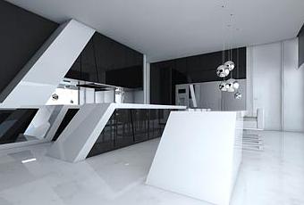 Esta cocina está ideada para un espacio reducido. La encimera en blanco y negro está acabada en corian, al igual que la isla central y la mesa de office en vuelo. Los muebles altos y bajos se realizan en madera, y tanto la campana como la lámpara tienen revestimiento en espejo. La encimera atraviesa la cocina creando una línea en zig zag de suelo a techo.