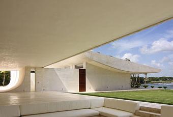 El porche queda alojado bajo los volúmenes de mármol travertino que parecen desafiar la gravedad, sirviendo como nexo entre el interior y exterior de la vivienda.