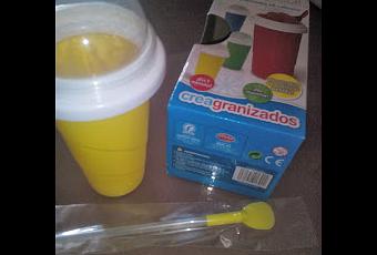 Os cuento: se trata de un vaso con doble pared entre las que lleva un “líquido mágico” (eso fue lo que le dije al peque) , una tapa y una cucharita….su modo de empleo es de los más fácil, porque únicamente tenemos que introducir el vaso en el congelador un mínimo de 4 o 5 horas, después le ponemos la bebida que queramos granizar (CUALQUIERA) , tapamos yvamos apretando el vaso (aprox. 1 o 2 minutos) y veremos como se empieza a transformar en una impecable granizada
