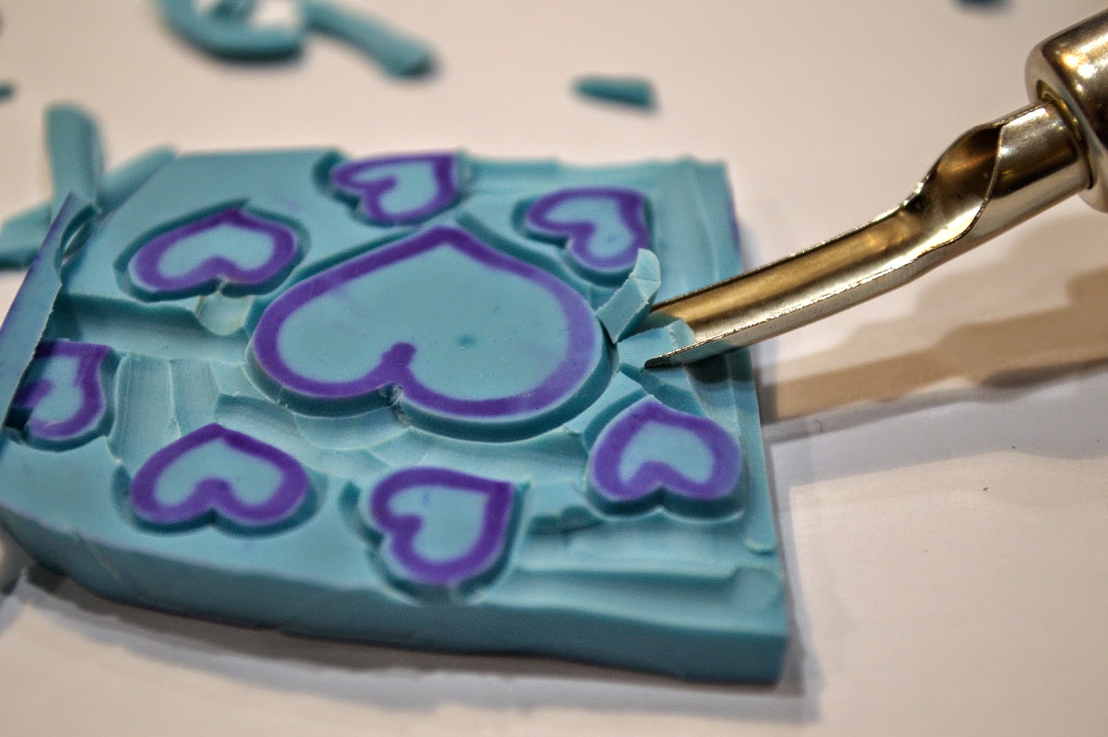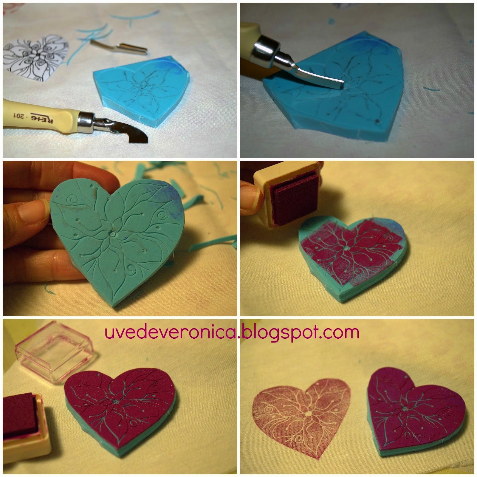 Este tipo de sellos es a la inversa, sólo carvamos el dibujo y se imprime todo excepto la silueta, letras o dibujo.