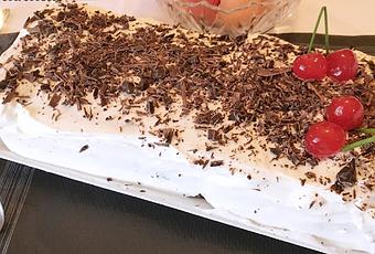 Se monta la tarta por capas de bizcocho con relleno de nata con cerezas en almíbar troceadas.