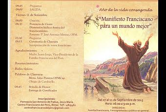 Nuestra Semana de Estudios Franciscanos 2015, tiene como lema el título de uno de los libros de nuestro connotado expositor central fray José A. Merino, "Manifiesto franciscano por un mundo mejor". En nuestra sociedad actualmente prevalece el nihilismo en la cultura dominante, por ello es urgente ofrecer una visión franciscana de los valores a partir de la cordialidad y de la cortesía; reflexionaremos también el cómo ofrecer una propuesta concreta de acción social en clave franciscana, propuesta que no es mera teoría, sino que lo corroboran una pléyade de santas y santos, en este contexto acogeremos el testimonio de nuestros mártires franciscanos de Pariacoto.
