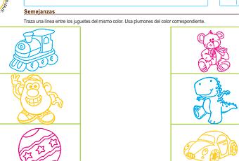 Actividad a realizar: Traza una línea entre los juguetes del mismo color. Usa plumones del color correspondiente.