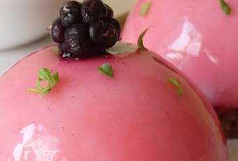 Glaseado de moras:Hidratamos la gelatina en una taza con agua fría.En un cazo ponemos el zumo de moras, la glucosa y el azúcar. Calentamos hasta los 103ºC. Retiramos del fuego y cuando alcance los 80º C añadimos la gelatina hidratada y escurrida, mezclamos bien con unas varillas. Dejamos que baje la temperatura entre 35º-30ºC.Montaje: Sacamos del congelador las semiesferas. Las ponemos sobre una rejilla y bañamos con el glaseado de moras. Colocamos encima de los círculos de bizcocho. Lo decoramos poniendo una mora encima y con brotes de lenteja.
