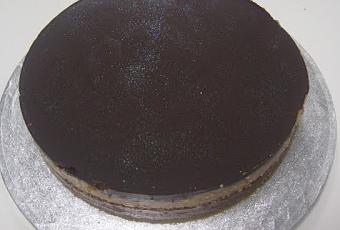 Cuando la crema de chocolate esté ya algo solidificada verter la crema de turrón de Jijona, dejando un espacio para poner el glaseado. Dejar en la nevera hasta que esté bien solidificado. Preparar el glaseado poniendo en un recipiente todos los ingredientes indicados para ello (cobertura, mantequilla y nata líquida). Calentar suavemente en el microondas o en un cazo y dejar que se funda. Una vez fundido dejar que quede templado y verter con cuidado por encima de la Mouse de turrón de Jijona. Dejar de nuevo en la nevera. Cuando se vaya a servir retirar el molde y adornar al gusto.