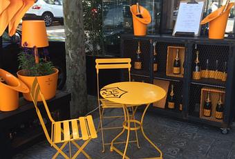 Vitrina expositora industrial, sillas Cafe de paris y mesa Arc con plancha con el logo de la prestigiosa marca de champange Veuve Clicquot .