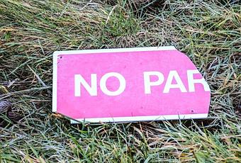 Una señal de tránsito se rompió y acabó señalando hacia abajo.