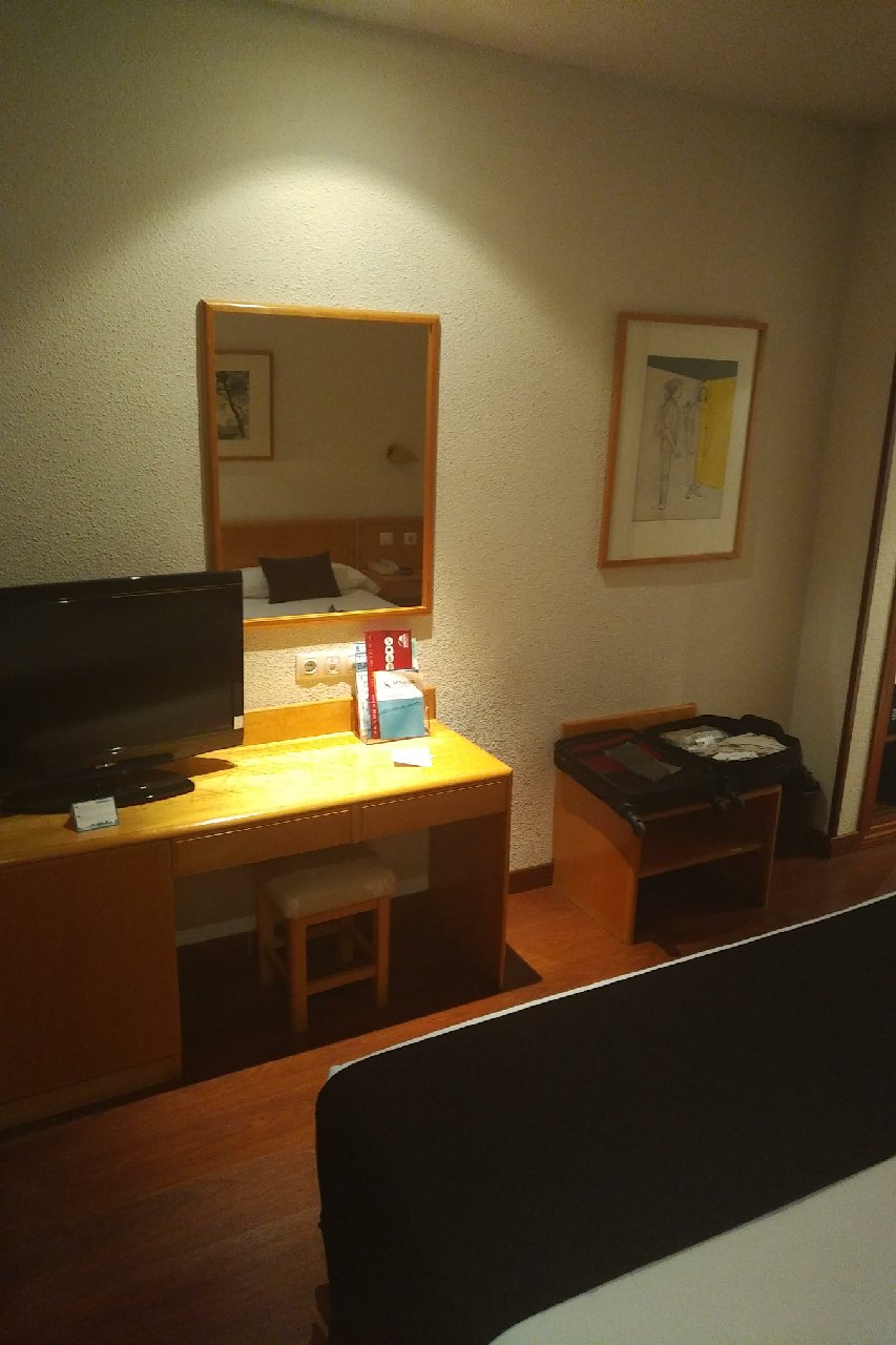 Unos pasos más a la derecha, tras otras escaleritas de mármol negro (dejando atrás el claro) encontramos los tres ascensores que prestan servicio. Nuevos, modernos y cuidados. Con algunos carteles de los servicios de restauración del hotel. Las puertas se abren en la primera planta a un recibidor con suelo moderno porcelánico en tono metalizado. Enfrente una pared de estuco color crema con un espejo y los carteles (los antiguos del Tryp) indicando la dirección de las habitaciones. El pasillo está totalmente cubierto de telas (sábanas, toallas, cortinas...). Deben estar arreglando alguna habitación. Bajo las telas, una moqueta en tonos grises bastante cuidada. A derecha e izquierda se abren las puertas de las habitaciones, en madera oscura algo pasada de moda. La luz del pasillo es generosa pero poco efectista.La luz, el desgastado y trabajado mobiliario (de madera clara brillante con numerosas marcas de cigarrillos), la pared... sigue ofreciendo esa sensación de "rancio" y "caduco" que ya ofrecía la recepción. A la derecha, y de seguido, hay un maletero de madera. Sobre él, un aburrido cuadro. A continuación un pequeño escritorio sobre el que cuelga un espejo y descansan varios folletos del hotel y una televisión plana. Debajo, la silla es una incomodísima banqueta que hace misión imposible el trabajar allí, y junto a ella, un minibar con cuatro botellas de agua mineral cortesía del hotel (¡bien!).