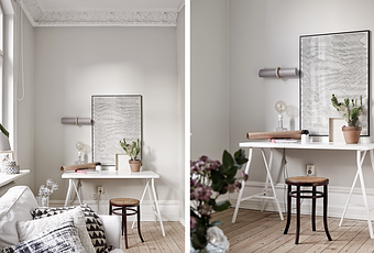 Para su decoración se utilizaron muebles ligeros y textiles de algodón en colores blancos con ligeras pinceladas en cojines estampados en gris y negro. El estilismo de esta vivienda es sencillo, siguiendo el lema "Less is More" que tanto gusta en los países nórdicos, creando una sensación de amplitud y luz.