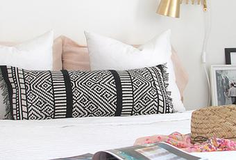 FuenteSeguro que más de una vez has pensado como decorar tu dormitorio con un presupuesto reducido, pues este es un ejemplo perfecto y si os fijáis las fundas de las almohadas son rosa cuarzo... así que esta a a la última con cuatro cositas... ESPEJO + APLIQUES DORADOS + TEXTILES