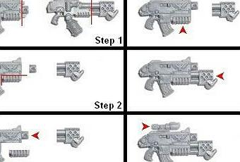 Tenia pensado subir otra cosa, pero tras pensarlo un poco, os dejo esto.Es una especie de tutorial en una sola imagen para, en siete sencillos pasos,hacer un combi bolter + lanzallamas a partir de un lanzallamas y un bolter de Marines Espaciales.