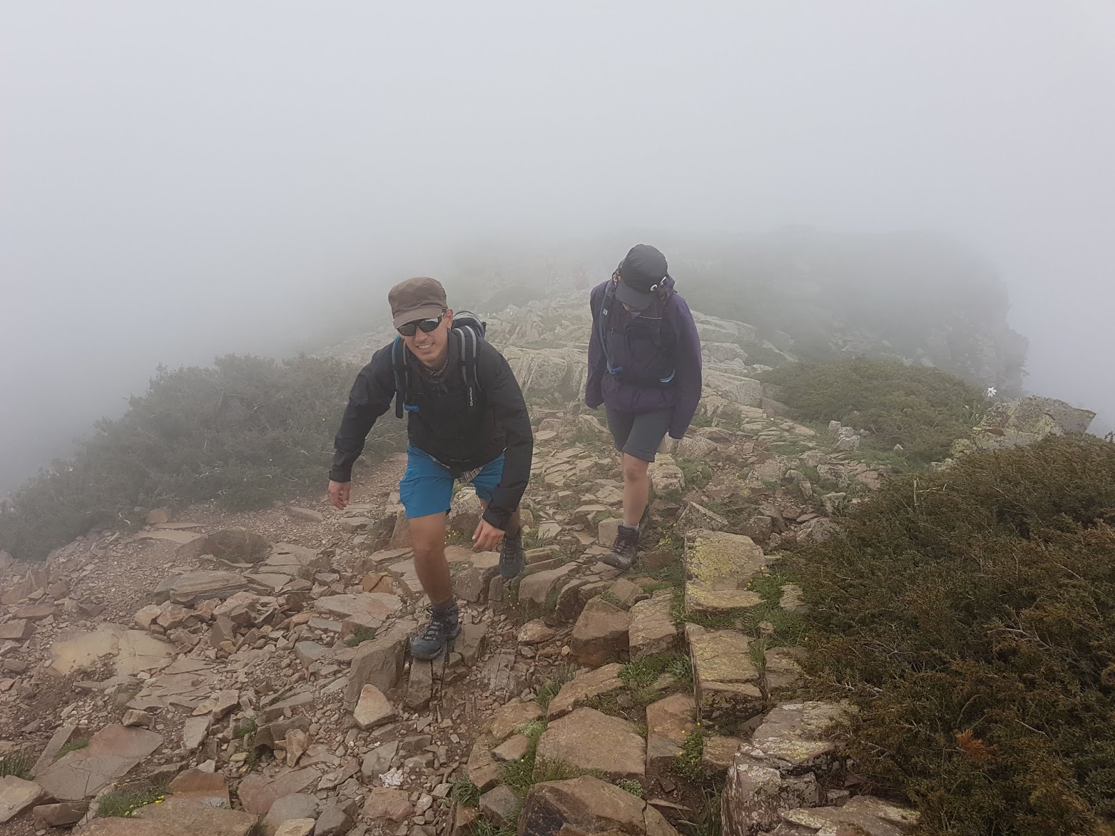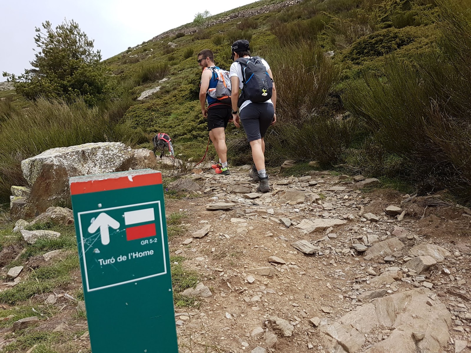 Una vez salimos del bosque empezó el ascenso de verdad, el de pendiente pronunciada y rocas grandes. Llegamos hasta el Turó de l’Home a la vez que las nubes y el viento así que nos hicimos las fotos de rigor y nos fuimos a comer el bocadillo a una zona algo más resguardada.