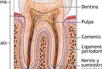 Si la cavidad dental está correcta, la dentina se encuentra protegida por el esmalte (corona) y por el cemento (raíz).