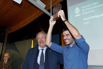 Toni Delgado levanta el trofeo que acredita a Cronómetro de Récords como galardonado en la categoría de prensa digital de los Premis de la Fundació del Bàsquet Català de Periodisme Esportiu 2019. Foto: M.A. Chazo / FCBQ.
