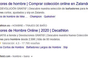 Veamos un ejemplo buscando el término "bañadores de hombre". En los puestos de trabajo superiores, independientemente de los anuncios de pago, corresponden a portales como hm, Zalando, Decathlon, My Springfield o Amazon, etc.