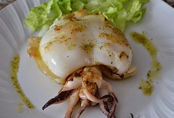 Ingredientes:Una sepiaUn diente de ajoPerejilaceite de oliva virgenSalPreparación:Ponemos la plancha al fuego que se caliente y echamos unas gotas de aceite, cuando este caliente ponemos la sepia previamente lavada y secada.La hacemos por un lado y al cabo de un rato le damos la vuelta por el otro lado, mientras haremos la picada de ajo y perejil.Ponemos en el vaso de la batidora el diente de ajo un poco de perejil, un poco de aceite que lo cubra y un poco de sal trituramos y reservamos.