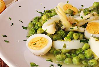 Sepia, guisantes y para terminar unos huevos, en este caso de codorniz, son los componentes de este sencillo y rico plato.