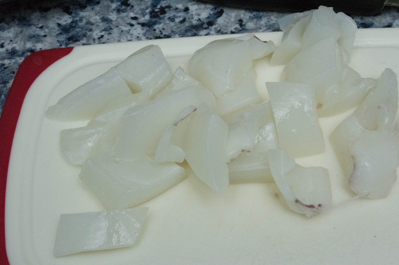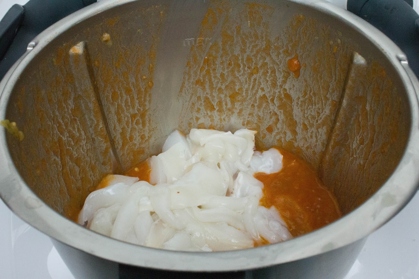 Prgoramar a temperatura varoma, 9 minutos, velocidad cuchara con giro invertido. Mientras ir picando la sepia en trocitos.