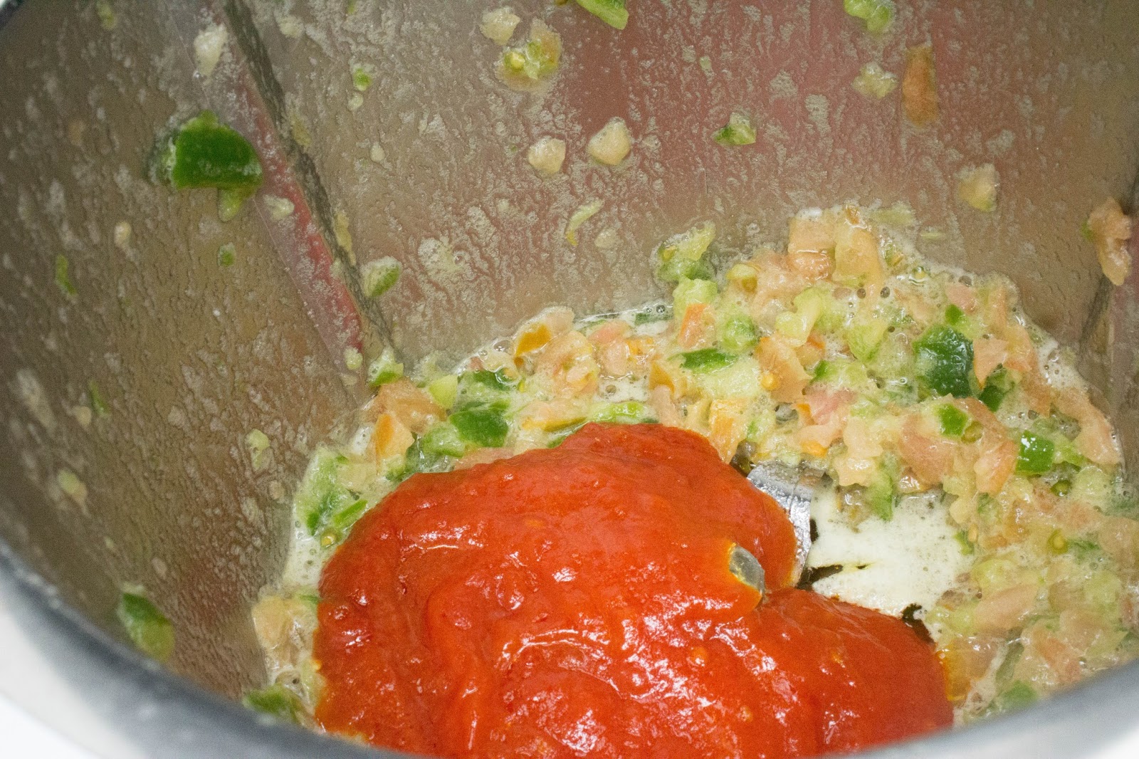 Picar los tomates y el pimiento verde en trozos grandes y añadirlo todo en la Thermomix.