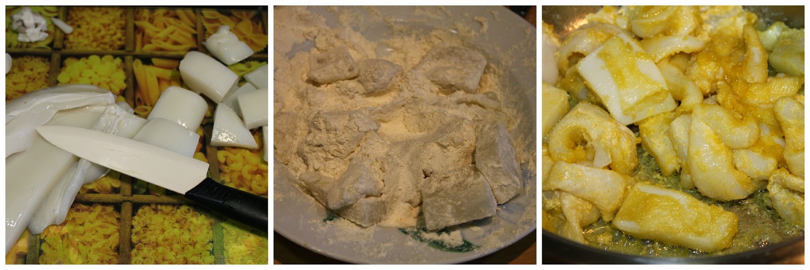 1.- Limpio la sepia y la troceo. La salo y la enharino. La frío en AOVE bien caliente, hasta que se dore.