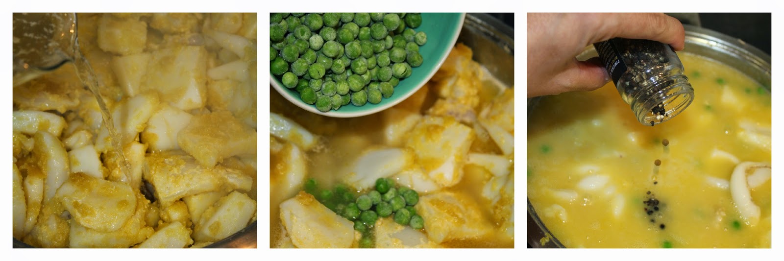 2.- Añado los guisantes, el caldo de pescado y la pimienta. Pongo al punto de sal y cuezo a fuego lento, tapado, durante unos 40 minutos.