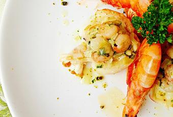 8-12 sepias pequeñas1 puerro1 pimiento verde italiano300 gr.de gambas peladas crudas12 langostinos1 diente de ajoPerejilPistachosSalPimienta negraAceite de oliva virgen extraEn una sartén con un poco de aceitepochar el puerroy el pimento verde picados menudos con un poco de sal unos 10-12 minutos.Añadir el ajo picado, dar unas vueltas y poner las gambitas, rehogar y rectificar de sal y pimientaLavar las sepias, secarlas y cocinarlas a la plancha, unos 5 minutos por lado.Rellenar las sepias con la farsa, añadir perejil picado y los pistachos picados pequeños.Gratinar unos 5 minutos.Mientras cocer a la plancha los langostinos con sal, pimienta y un poco de aceite.Mejor que las ** Las cantidades de ** Los ** El tiempo de ** Las sepias no deben de cocerse demasiado, sino se vuelven correosas.