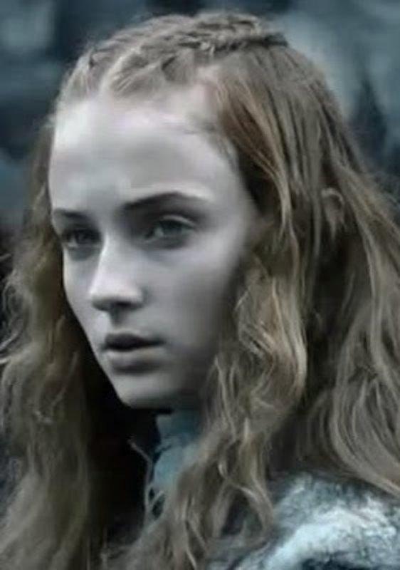 Sansa Stark (Sophie Turner) Es la mayor de las hijas de los Stark. Además de poseer un gran atractivo, tiene un amplio sentido por los caballeros y por el protocolo, instruido por la Septa Mordane en Invernalia desde que era una niña.Tiene una loba huergo llamada Dama.
