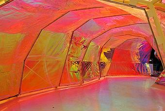 El Serpentine Gallery pavilion 2015 fue diseñado por José Selgas y Lucía Cano, y consiste en una piel de plástico de doble capa en una variedad de colores, envuelto alrededor de una serie de arcos de metal.