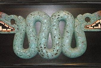 Relieve interpretado de una serpiente de un pectoral Azteca de madera, turquesa, concha y jade.